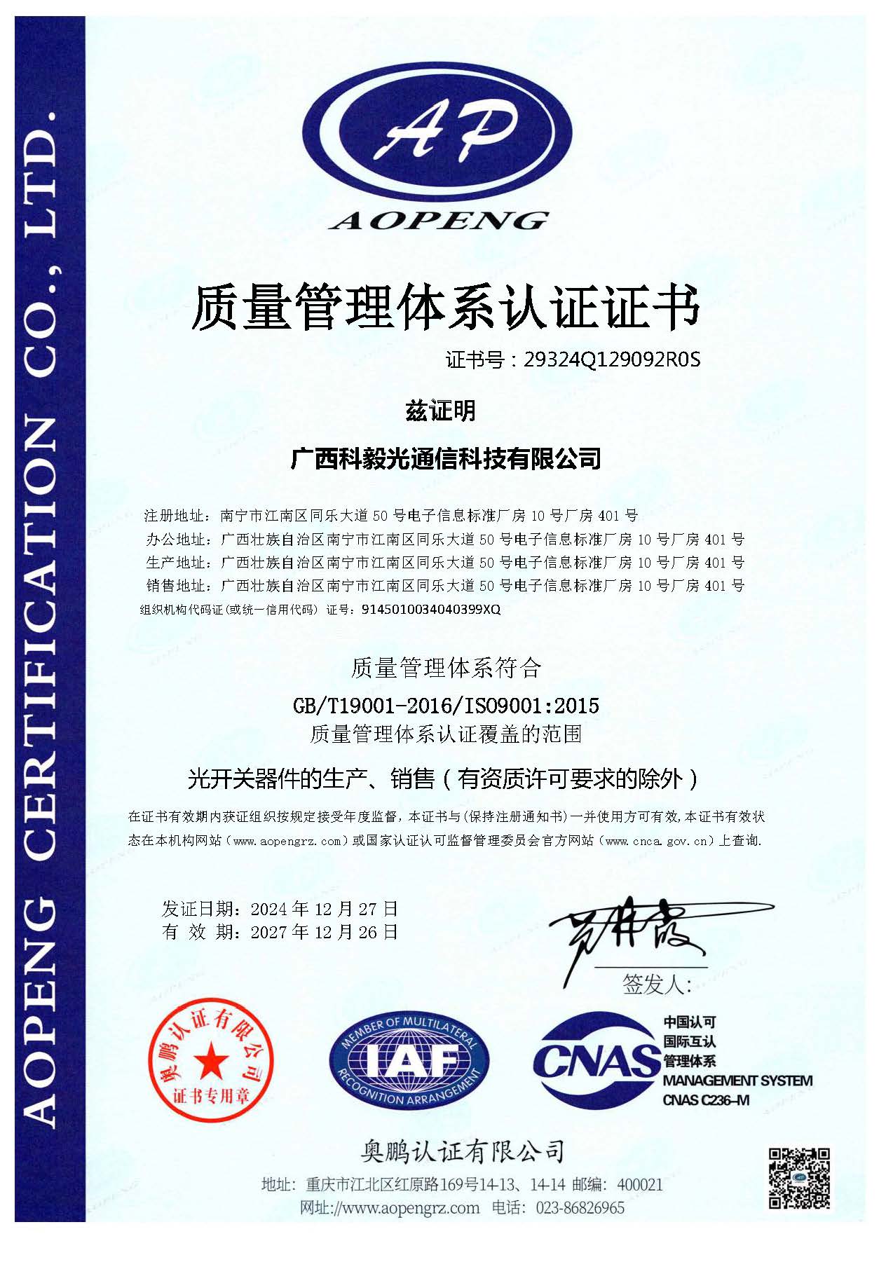 質量管理體系認證證書